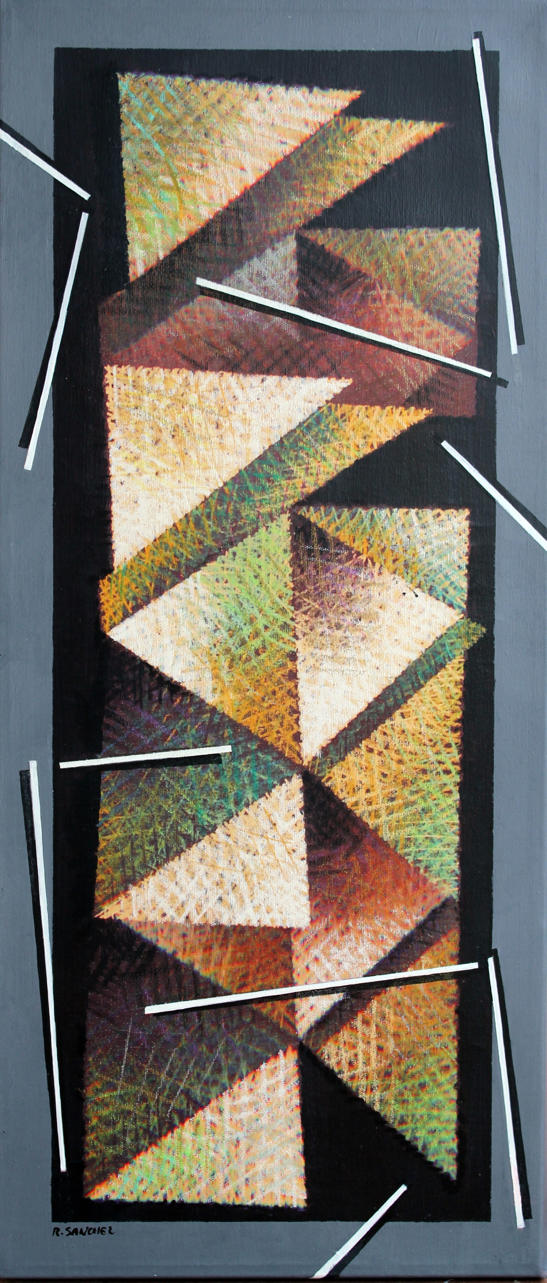Le costruzioni pittoriche di Roberto Sanchez, in bilico tra l’esigenza di un ordine razionale e la volontà di esprimere i propri umori, risentono delle ricerche astratte che, sul finire degli anni Settanta, videro protagonisti Barisani, De Tora, Di Ruggiero, Riccini, Tatafiore e Testa, riuniti nel gruppo di “Geometria e ricerca”. In questo clima culturale, moderno e stimolante, Sanchez ha formato la sua cifra stilistica, orientandosi verso la rappresentazione di piani obliqui che, in movimento continuo, attraversano lo spazio pittorico, s’intersecano e danno vita a trame di luce. Nell’intreccio dei piani s’intuiscono visioni urbane e simulazioni architettoniche, che perdono ogni residuo oggettivo, ogni riferimento alla realtà sensibile, per definire una struttura visiva pura. Una purezza che non è freddezza matematica ma equilibrio delle pulsioni, tradotte in accensioni cromatiche e delicati passaggi tonali. Su questa trama s’impostano segmenti verticali e obliqui, sintetiche allusioni agli uomini che abitano e vivificano lo spazio urbano.