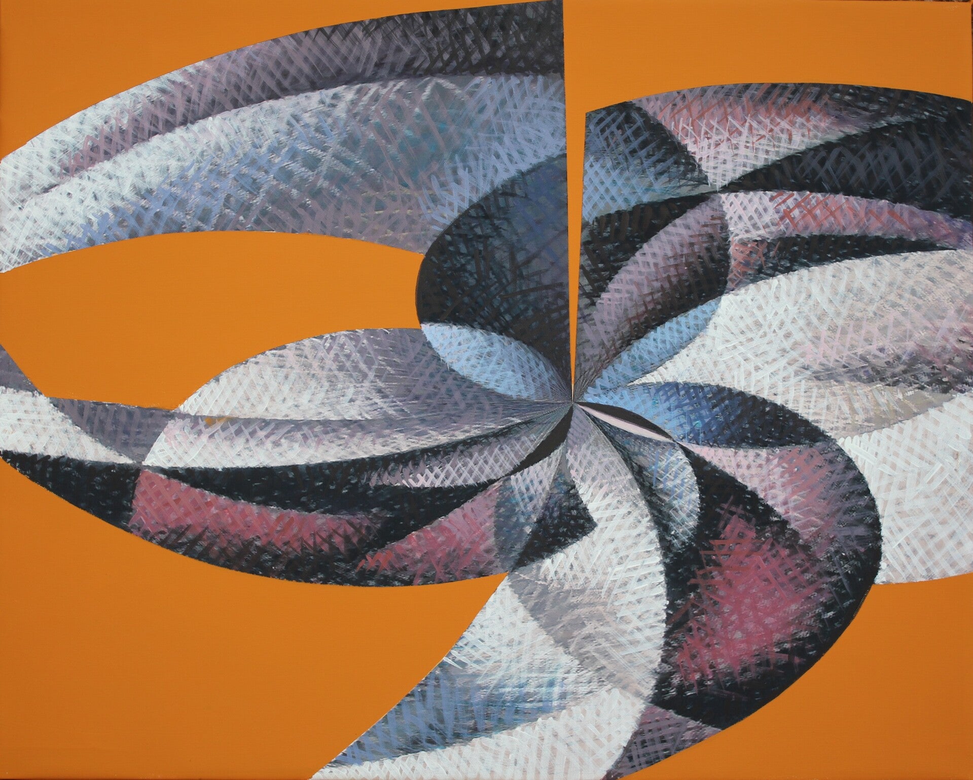 La composizione è equilibrata, con una tensione tra le superfici piatte e i segmenti curvilinei che si incrociano e si sovrappongono in maniera vorticistica. Le linee bianche sottili, in particolare, sembrano tagliare e connettere i diversi piani, introducendo un ritmo visivo che amplifica l’impressione di un “fermo immagine” catturato nel flusso temporale. È proprio questo concetto di transizione e passaggio, tipico dell’Astrattismo Progressivo, che caratterizza il lavoro: l’opera non si limita a raffigurare una forma, ma invita a cogliere un momento in un processo evolutivo.