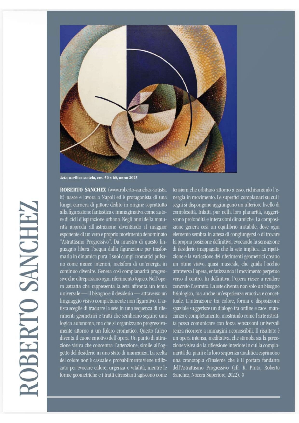 Roberto Sanchez, nasce e lavora a Napoli ed è protagonista di una lunga carriera di pittore attento e motivato. Dedito in origine soprattutto alla figurazione di caratura fantastica e immaginativa come autore di cicli d'ispirazione urbana approda negli anni della maturità all’astrazione diventando il maggior esponente di un vero e proprio movimento denominato “Astrattismo Progressivo”. Numerosi e autorevoli sono i saggi e gli scritti che lo riguardano soprattutto in relazione alla sua lunga attività espositiva.